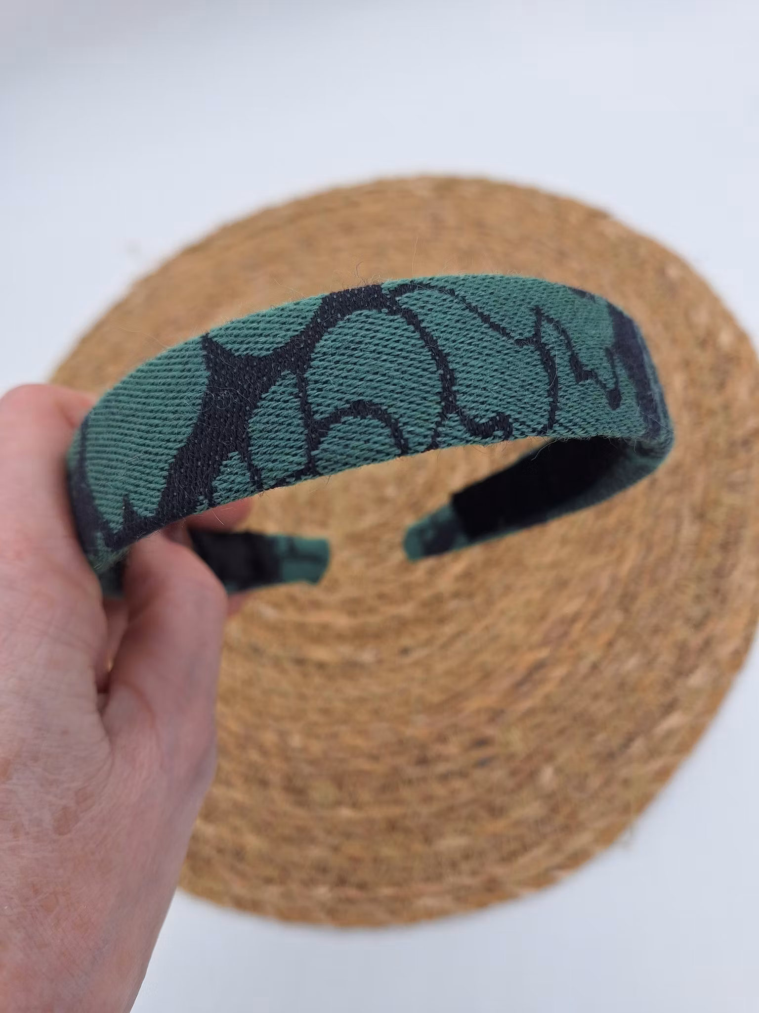 Hårbøyle til Nordmørsbunad i fargen grønn. Denne hårbøylen er 2,5 cm på det bredeste, og litt liten i størrelsen, så vil passe barn og opp til 15 år. Den er håndsydd av meg og har fløyelsbånd på baksiden. Har også 3 og 4 cm bred i samme mønster. Hårbøylen er tøyelig, slik at den ikke strammer hardt mot hodet. Jeg plages selv med hodepine og migrene, men fikk ikke smerter i hodet etter å ha brukt min hårbøyle hele 17.mai.