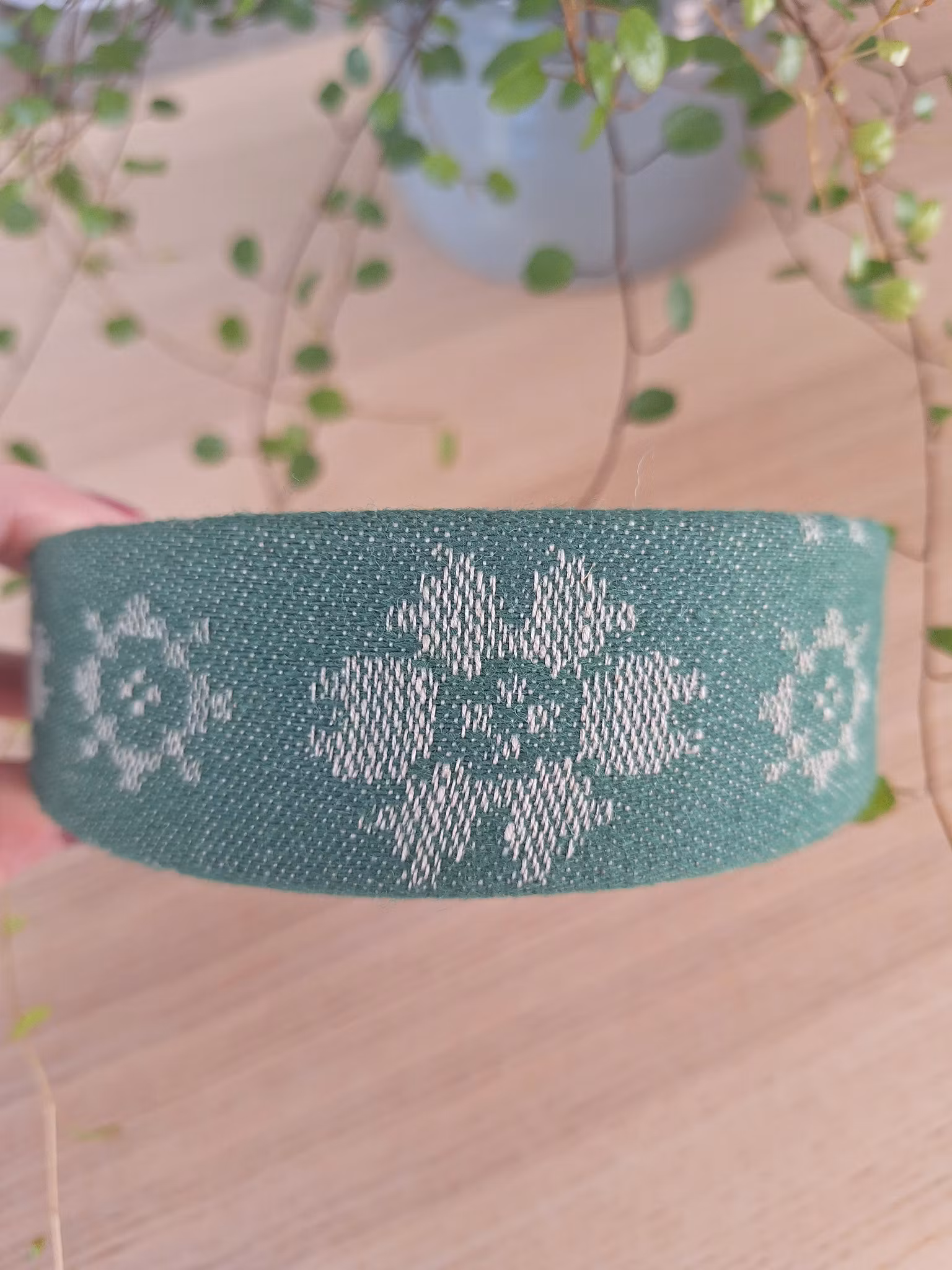 Hårbøyle til Sør Trønder bunad, enkel rose. Hårbøylen måler 4 cm på det bredeste, og er sydd sammen for hånd med fløyelsbånd på baksiden. Hårbøylen er