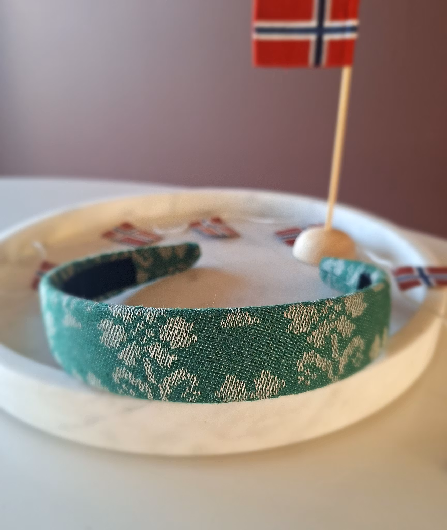 Hårbøyle til trønderbunad, grønn rose med stilk, 3 cm bred. Bøylen er laget av det orginale ullstoffet til trønderbunadens veststoff. Den har sort fløyelsbånd på baksiden. Passer fra 12 år og opp til voksen. En perfekt gave og som et pent supplement til bunaden.