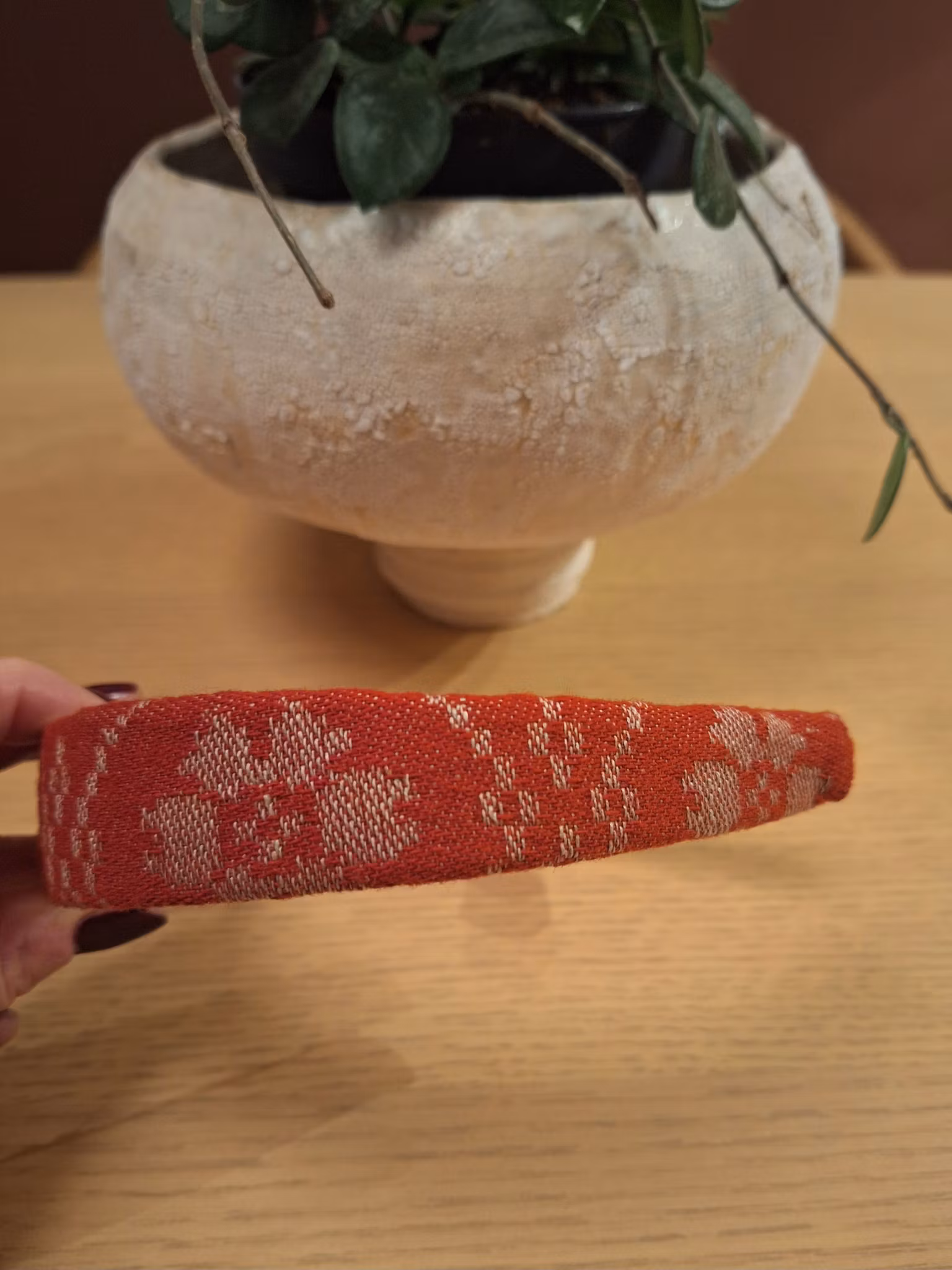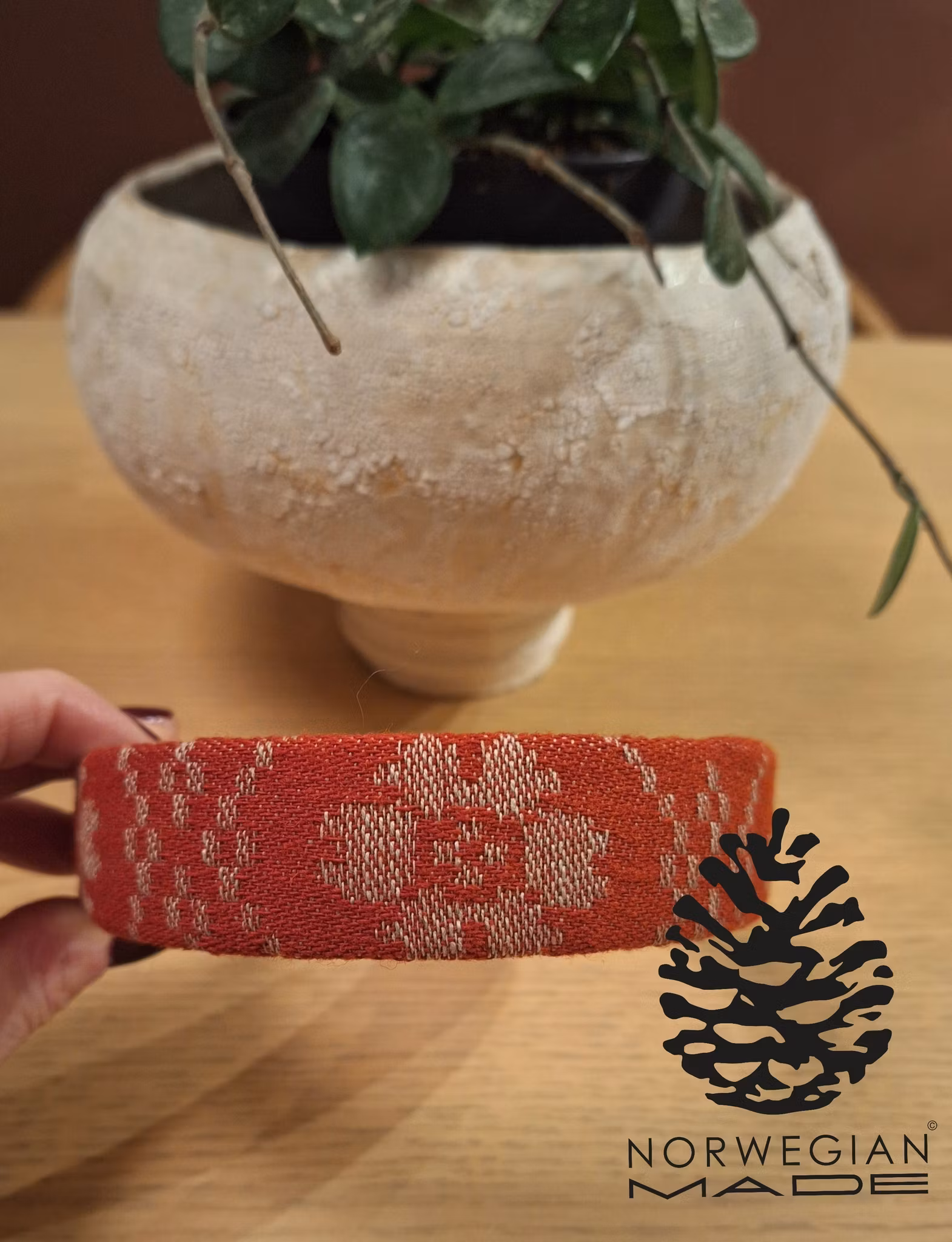 Hårbøyle til trønderbunad, rød rose med bølge. Bøylen er laget av trønderbunads veststoff og måler 3 cm på det bredeste. Den har sort fløyelsbånd på undersiden av bøylen.
