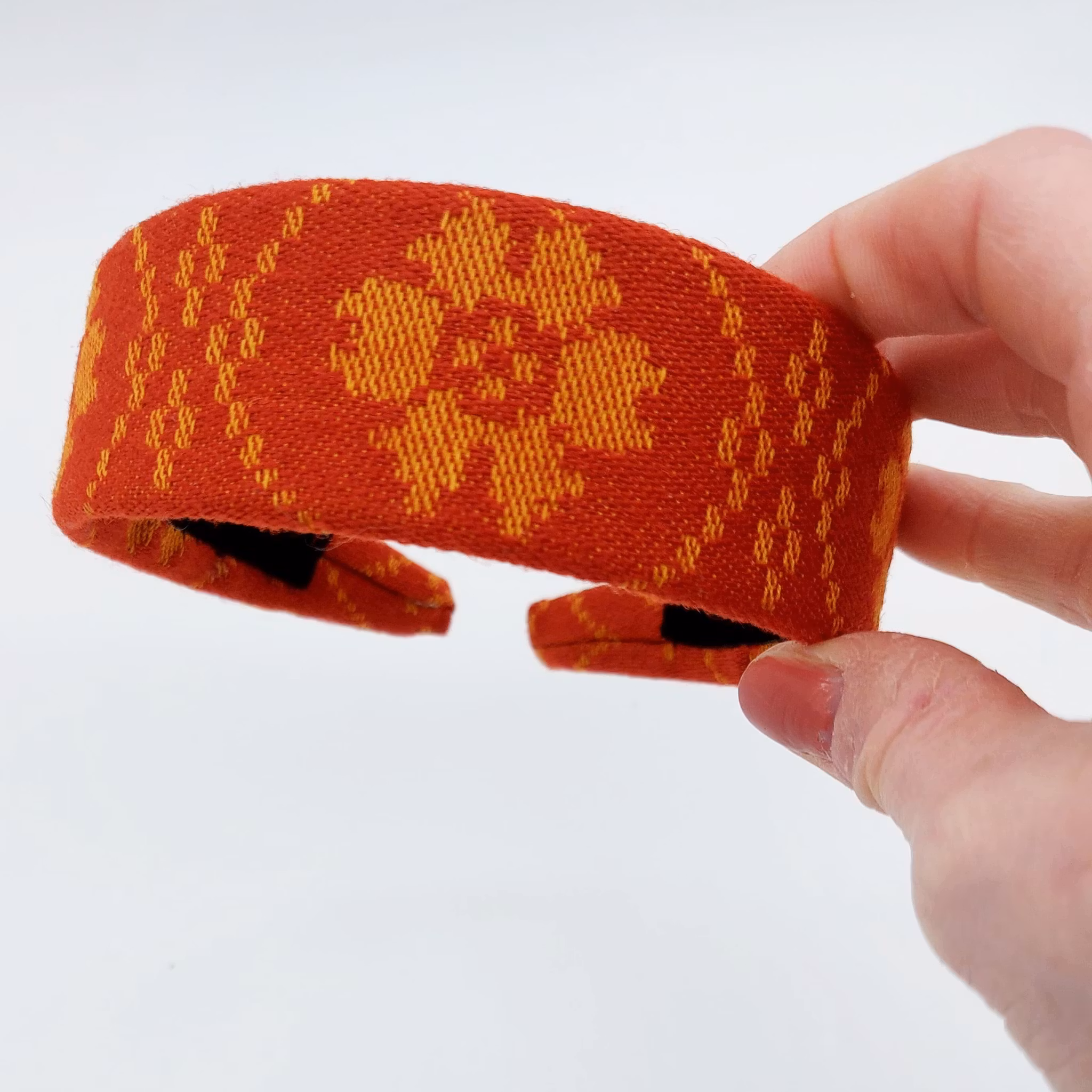 Hårbøyle til trønderbunad, rød rose Gloria. Bøylen er laget av trønderbunadens veststoff og måler 4 cm på det bredeste. Den har sort fløyelsbånd på undersiden. Passer til voksen og ungdom. En perfekt gave som et pent supplement til bunaden.