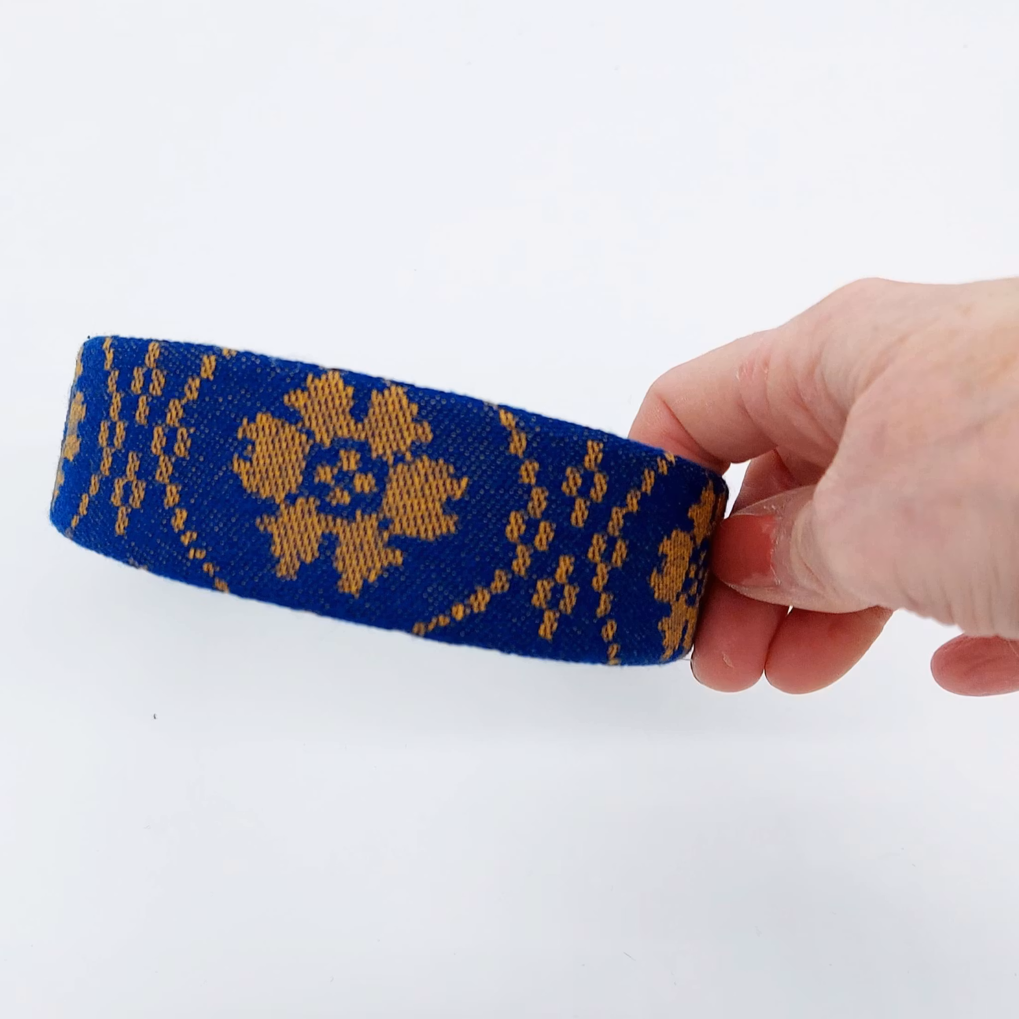 Hårbøyle til trønderbunad, blå Gloria Bøylen er laget av trønderbunadens veststoff og måler 4 cm på det bredeste. Den har sort fløyelsbånd på undersiden. Passer