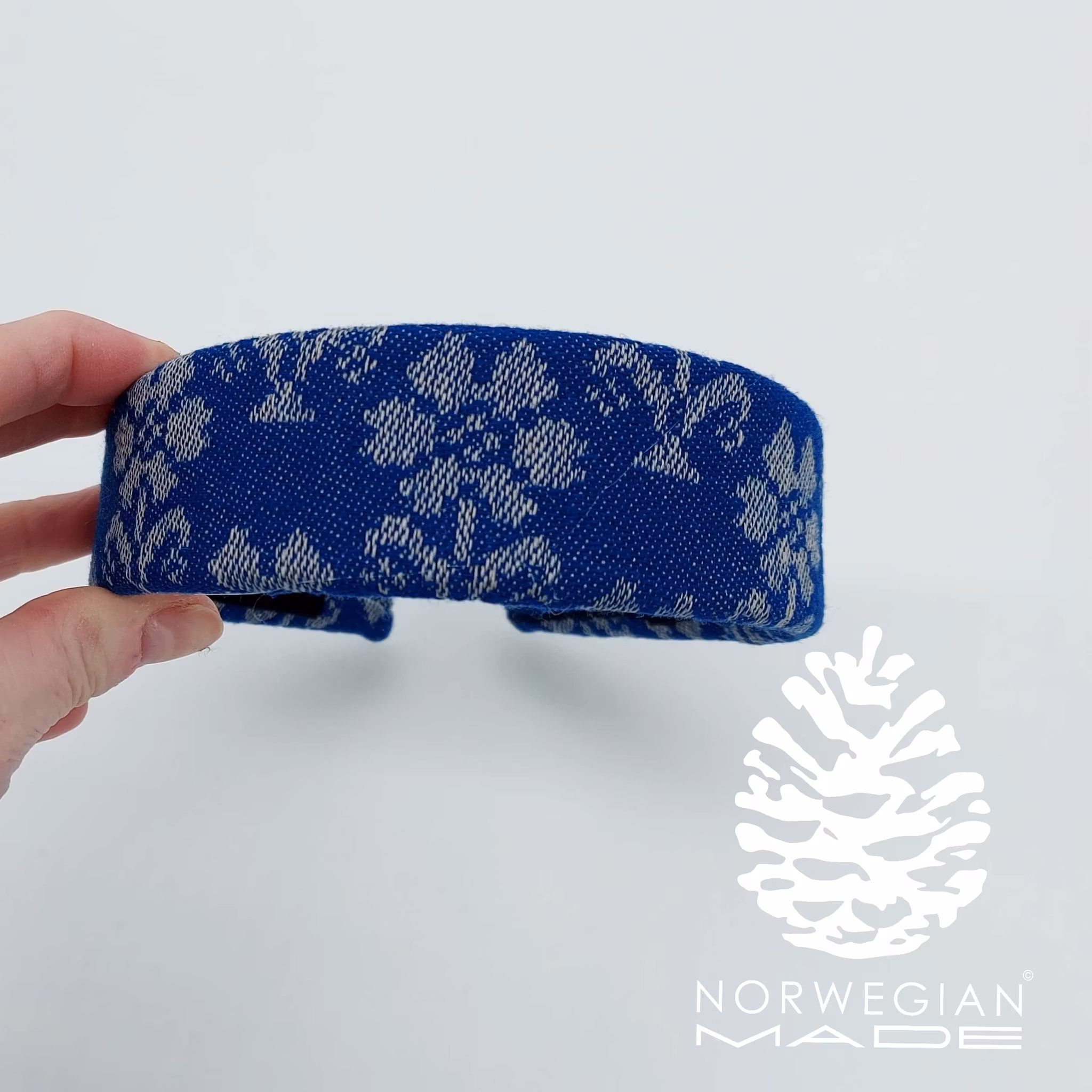 Hårbøyle til trønderbunad, blå rose med stilk. Bøylen er sydd av trønderbunadens veststoff. Hårbøylen er 4 cm på det bredeste og har sort fløyelsbånd på undersiden. Passer til voksen og ungdom. En perfekt gave som et pent supplement til bunaden.