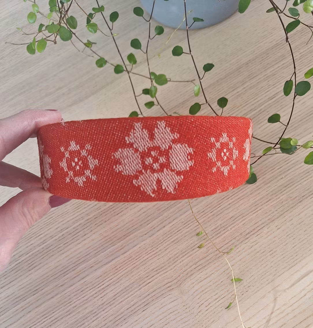 Hårbøyle til trønderbunad, rød rose enkel. Bøylen måler 4 cm på det bredeste og har sort fløyelsbånd på undersiden. Hårbøylen er sydd av livstoffet til trønderbunaden. Passer til voksen og ungdom. En perfekt gave som et pent supplement til bunaden.