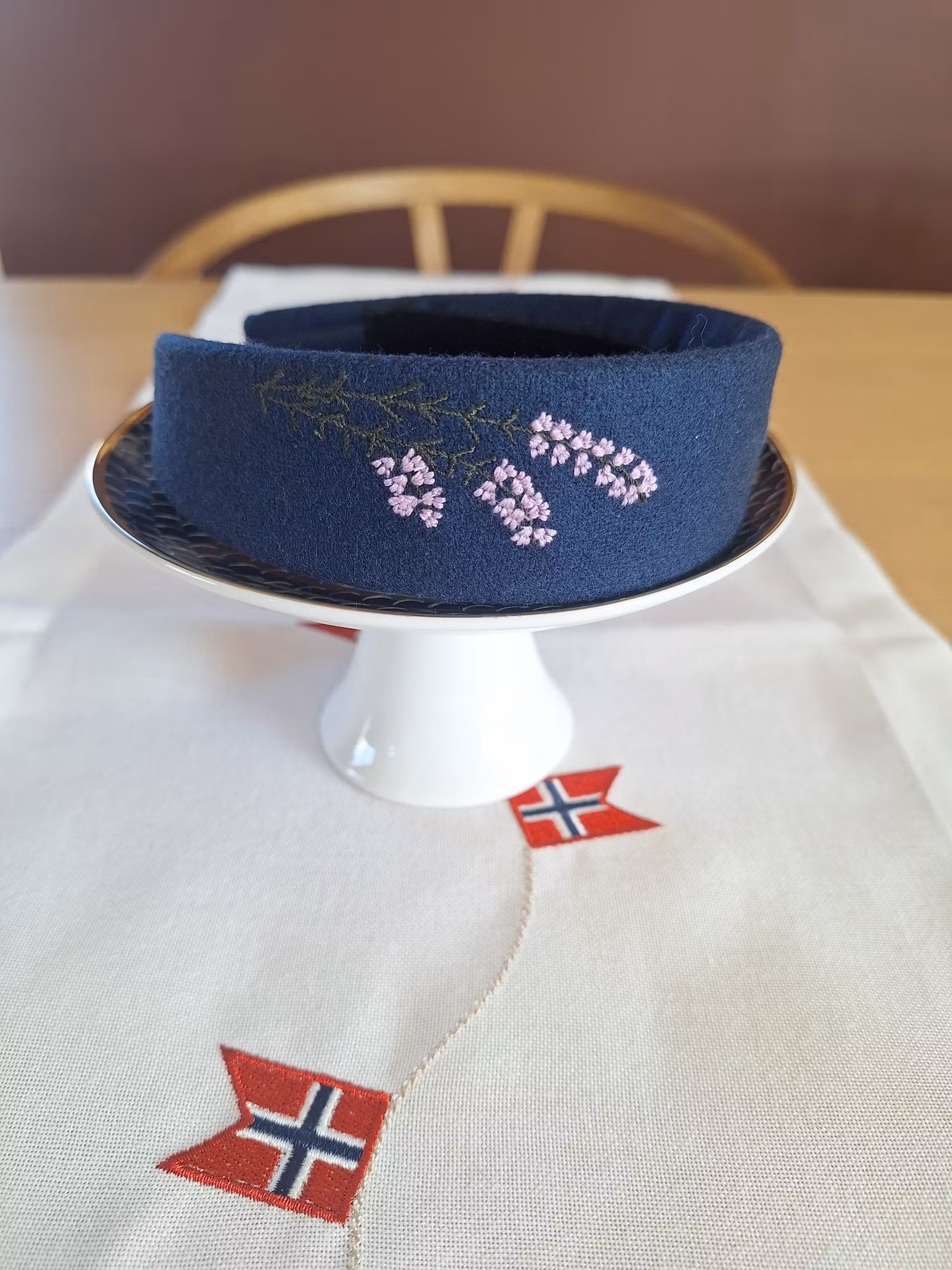 Inspirasjonen til Kystdraktens bunadsbroderi, har jeg hentet fra bunadens broderi og farger. Hårbøylen er maskinbrodert på bunadsull, og er 4 cm på det bredeste. På undersiden er det sort fløyl. En perfekt gave som et pent supplement til bunaden.