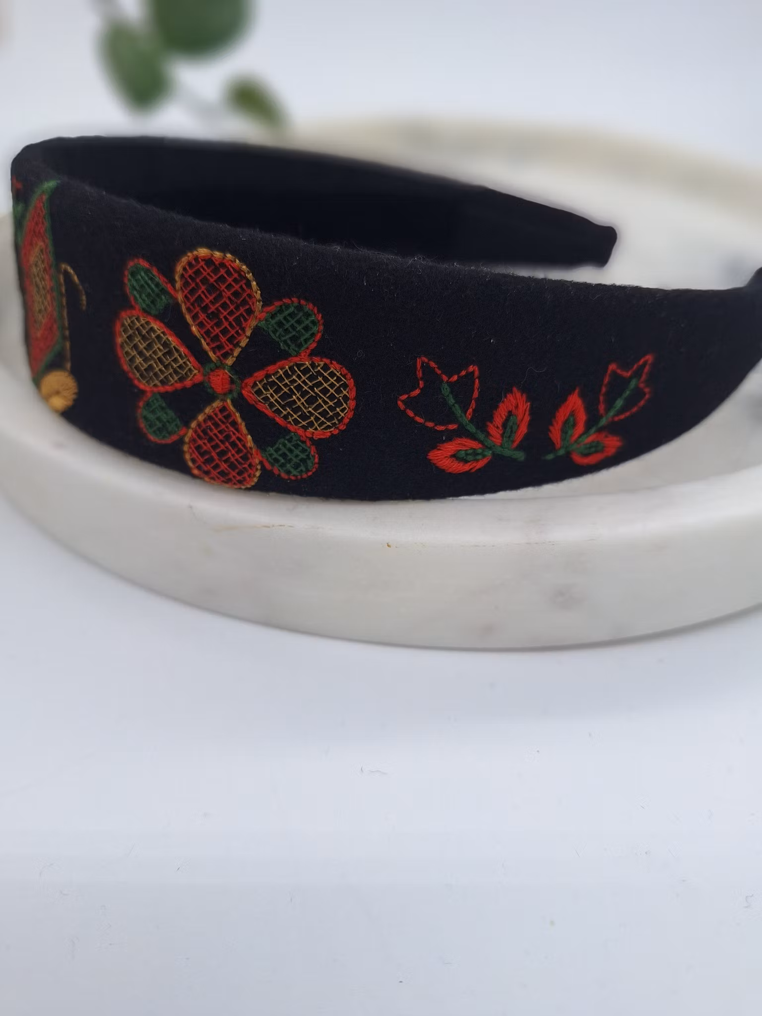 Hårbøyle inspirert av Meldalsbunad, maskinbrodert på bunadsull.