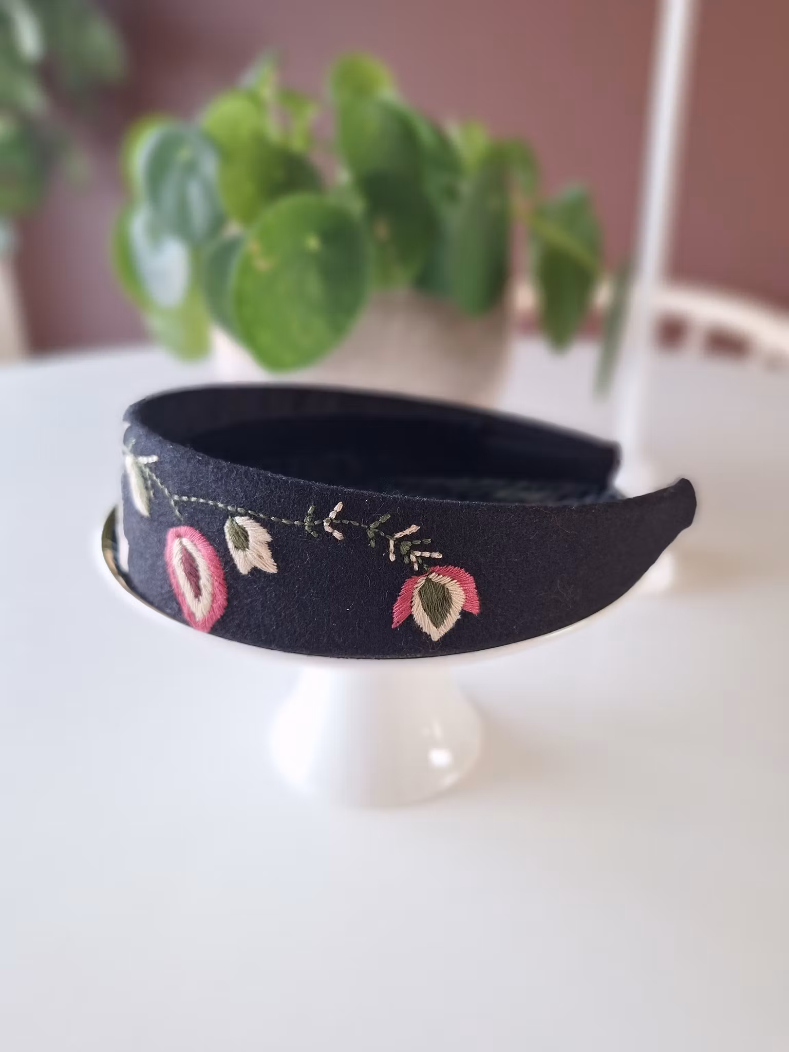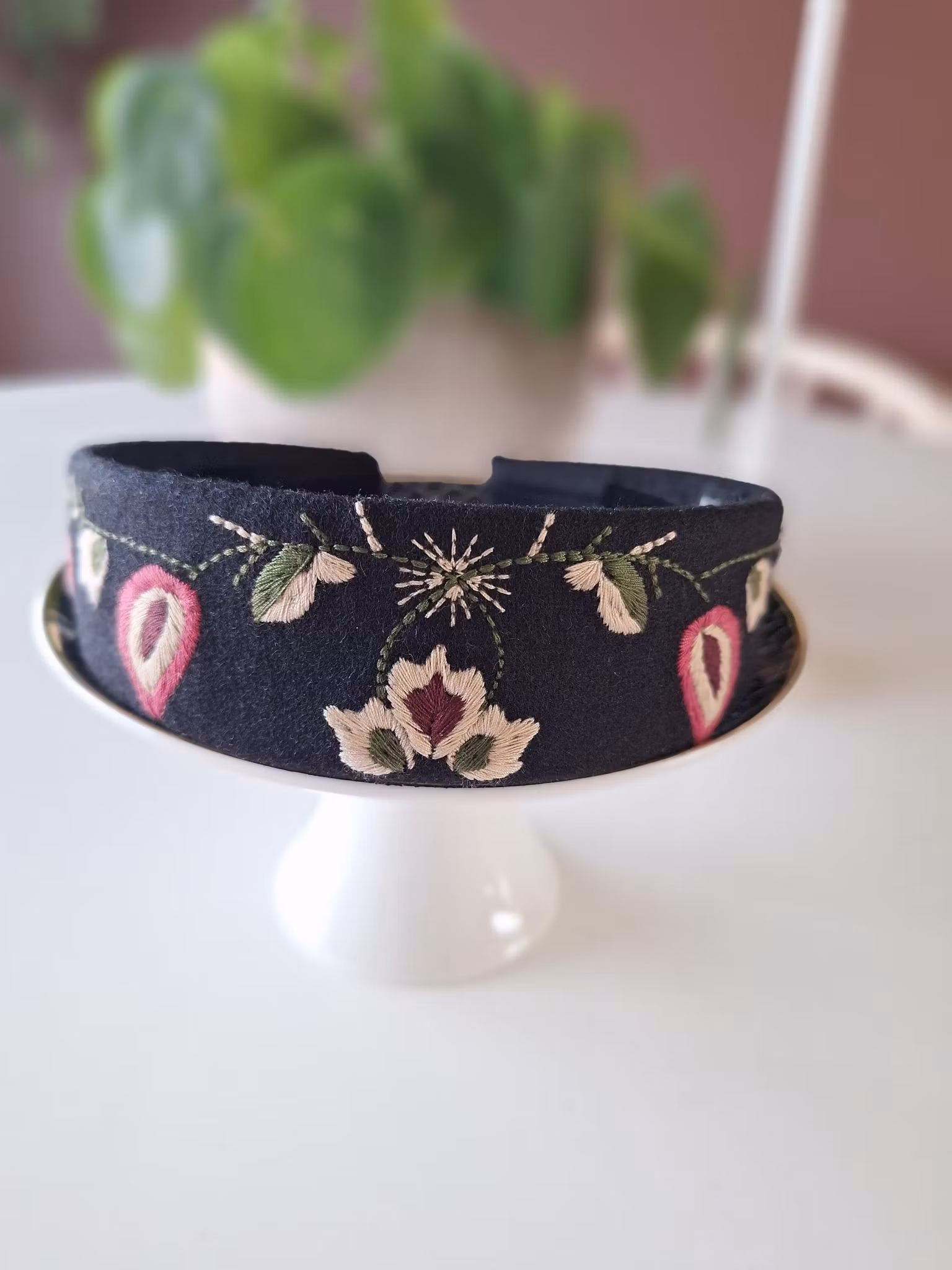 Hårbøyle inspirert av soknedal bunadsveske, lilla, som hører til trønderbunaden, maskinbrodert på sort bunadsull.
