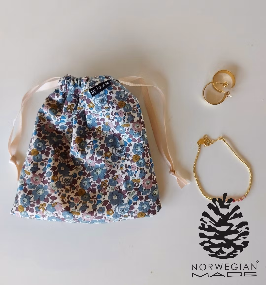 Smykkepose sydd i Liberty of London stoffet, Betsy Ann, småblomstret. Posen har snøring i sidene som lukning og den er foret med linstoff. Passer perfekt til å oppbevare smykkene dine når du er på reise, eller trenger et sted å oppbevare de. Posen er fin som gave, eller bruk den som innpakningspapir rundt den gaven du allerede har kjøpt.