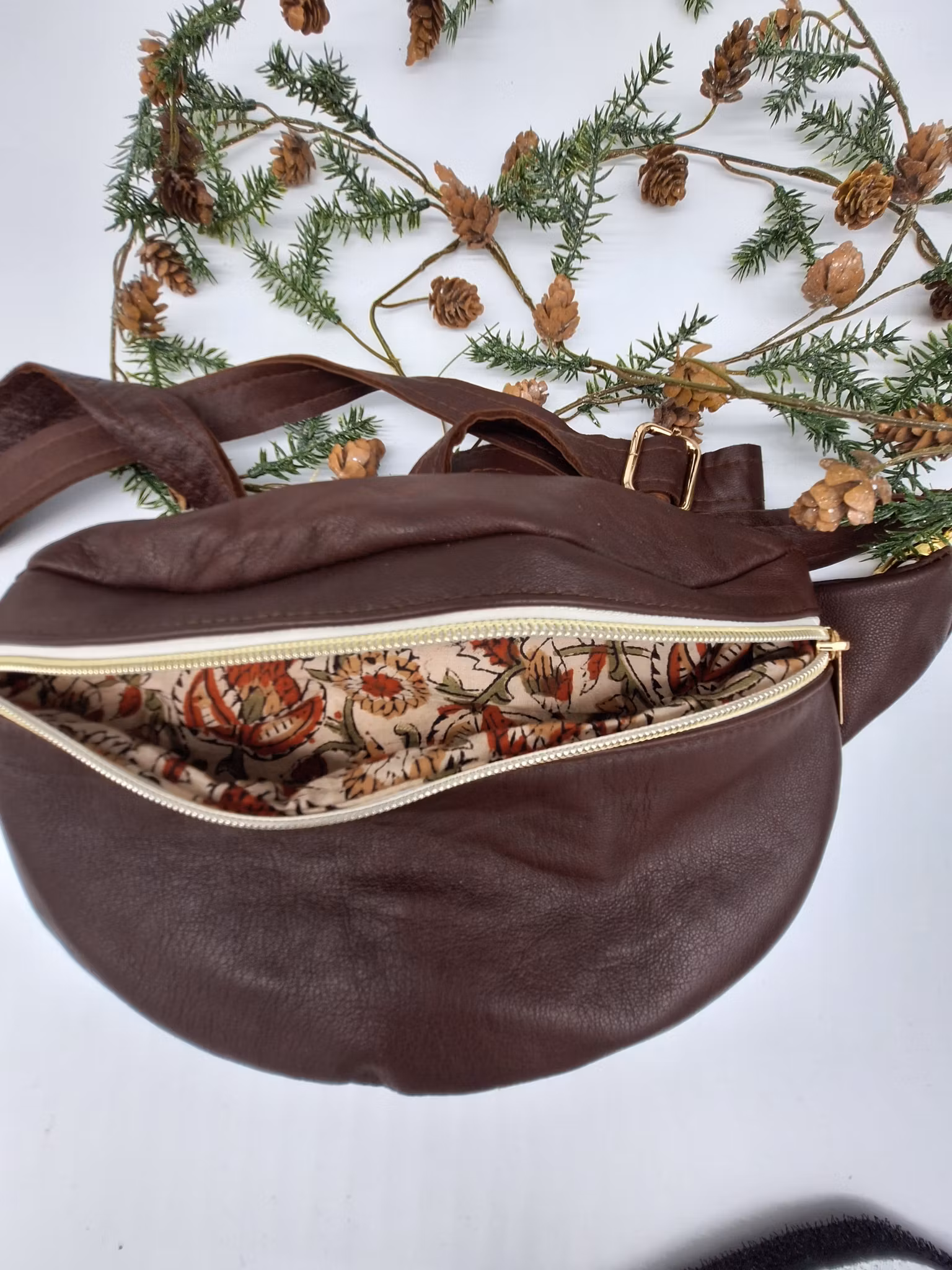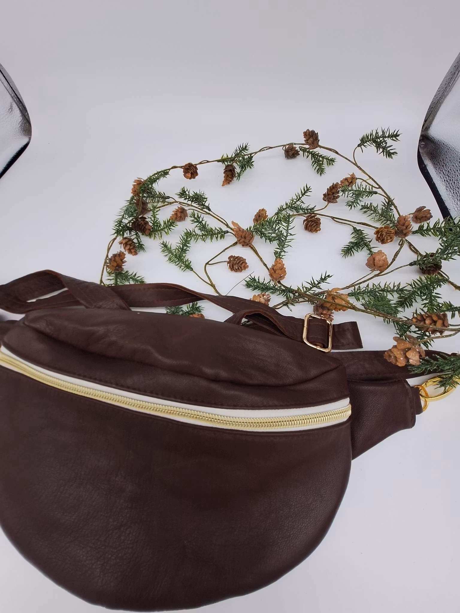 Bumbag eller magetaske om du vil, kjært barn har mange navn. Den er sydd i mykt og ekslusivt geitskinn, med detaljer i gull på glidelås og karabinkroker.