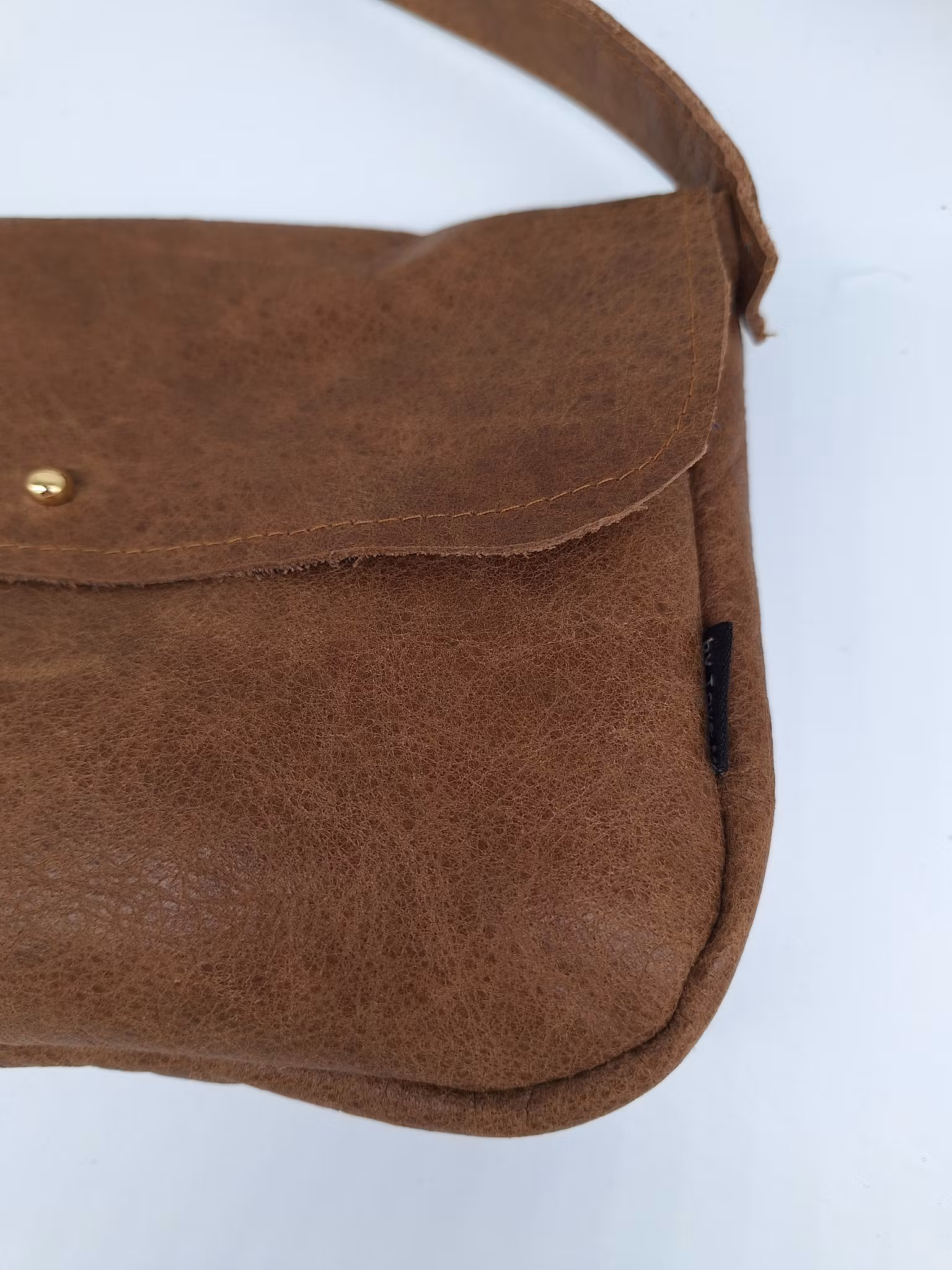 Søt veske i cognacfarget skinn til det nødvendigste. Rommer telefon, pengebok, nøkler og lebestift, og sikkert litt til. Regulerbar reim, nitte